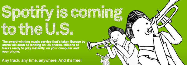 Something big, but far too delayed is happening tomorrow, Spotify is coming to the US. This is great news for Americans since spotify is an awesome free music provider. And their premium service is even better and definitely price worth. However they promised this to happen a long time ago, and now it is simply too late for them to be the biggest on the market. The two great competitors are Napster and Groveshark. Napster as you most likely know began as the worlds first p2p mp3 downloading network but has now become a legal cheap music provider. Grooveshark is almost the exact same thing as spotify except it work from any java enabled browser and is 100% free through ads. I wish spotify the best of luck, it’s delay has gained spotify some harsh competition!