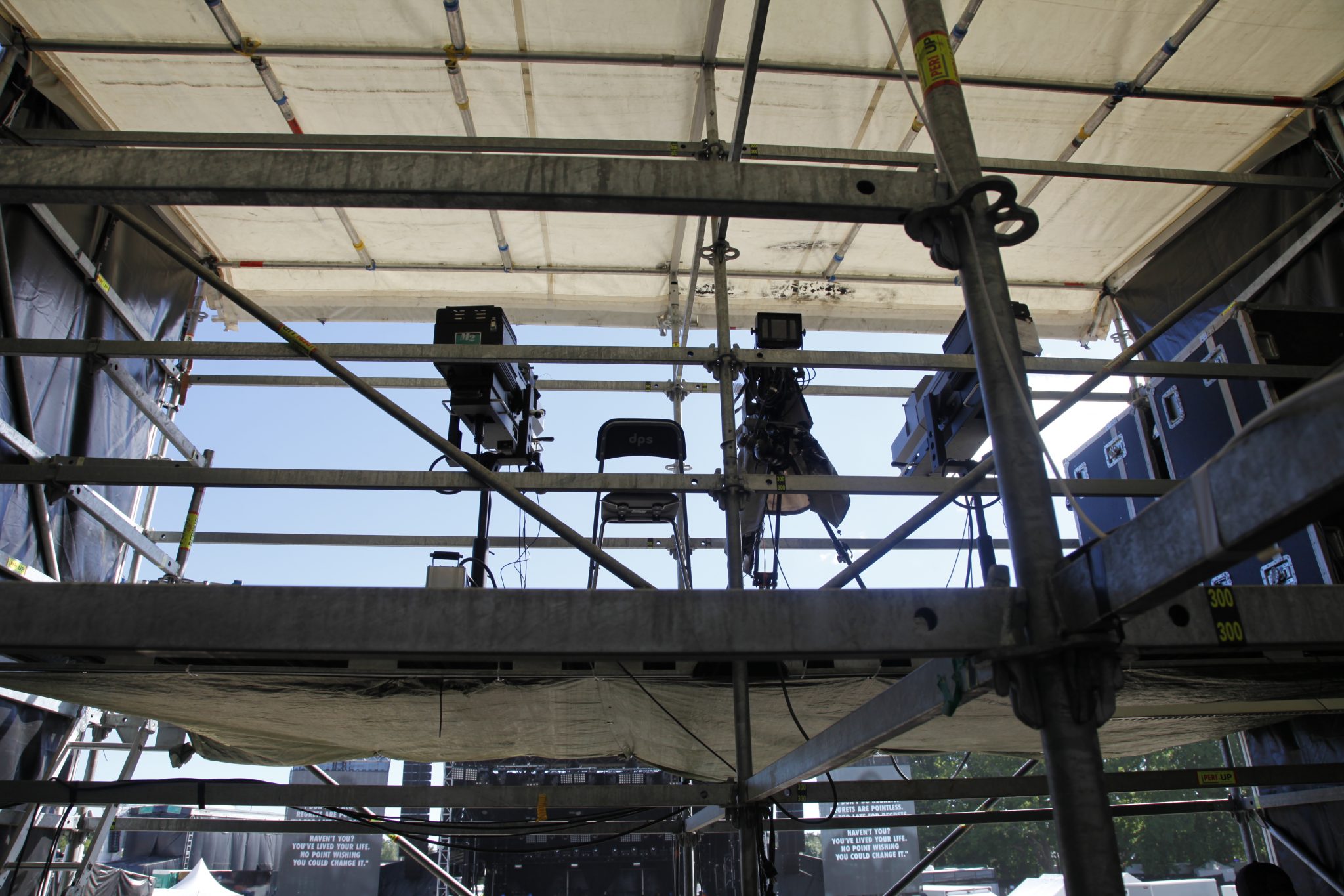 The video feed is then sent to a small hut where the video feed is edited in real-time. Lighting and such is tweaked before the feed is selected and sent to the big screens.